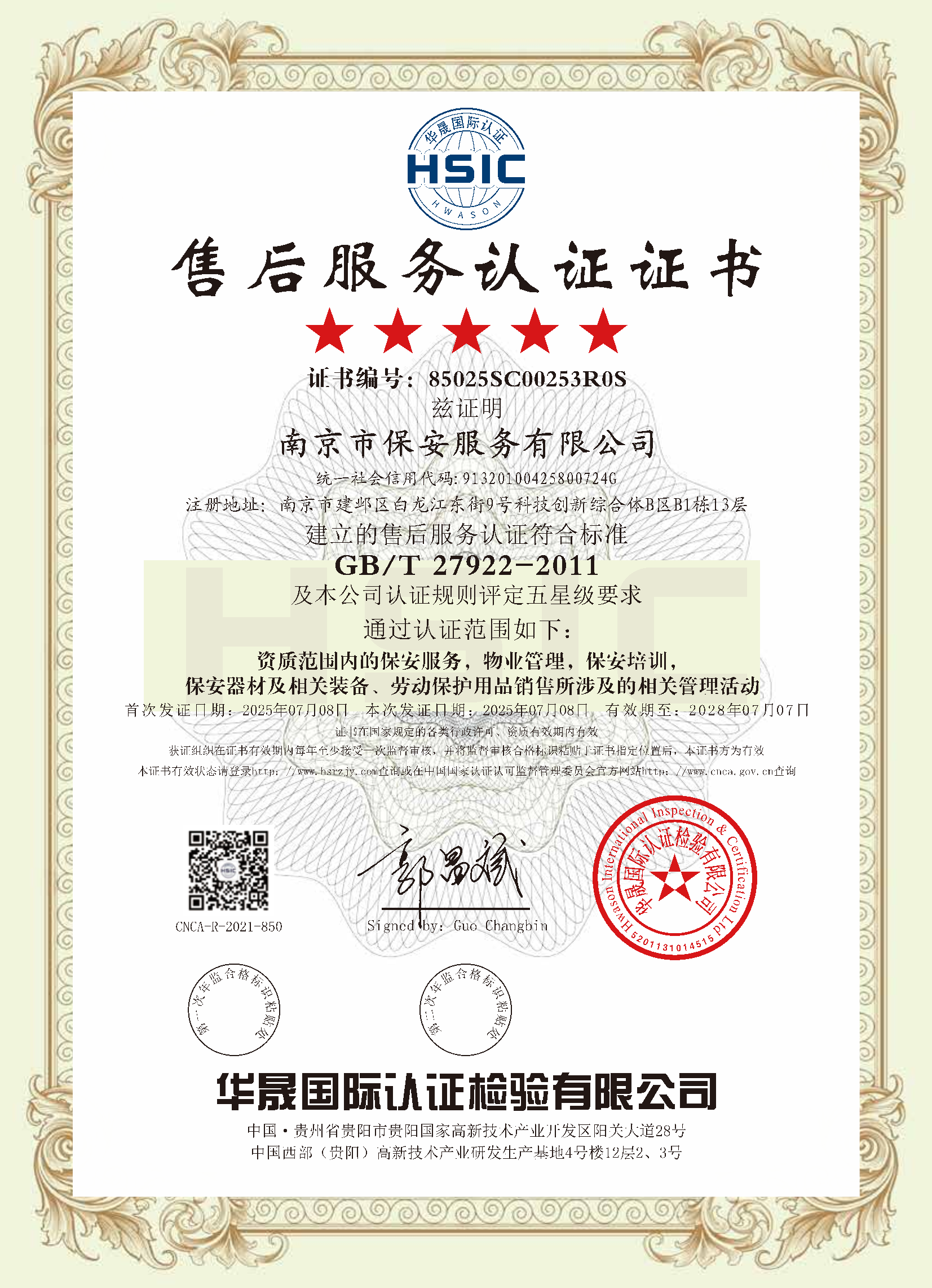 南京市保安服務有限公司(原南京市保安服務總公司)成立于1987年4月,是一個有著悠久安保經營歷史和安保經驗沉淀的大型國有保安企業,現為中國保安協會常務理事單位,江蘇省保安協會常務理事單位,南京市保安協會副會長單位,江蘇省一級保安服務公司。